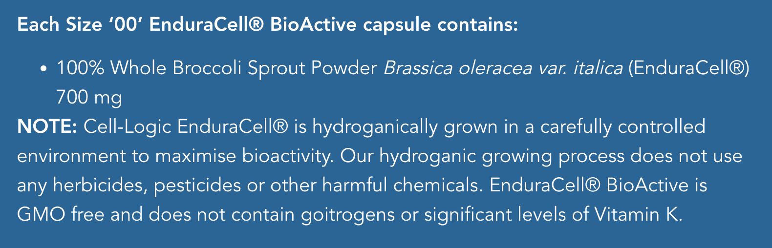 Cell-logic grow their own sprouts hydroganically, in a unique and specially cultivated environment in order to maximise bioactivity, potency and effects. Enduracell Bioactive does not contain goitrogens, or significant levels of vitamin K.