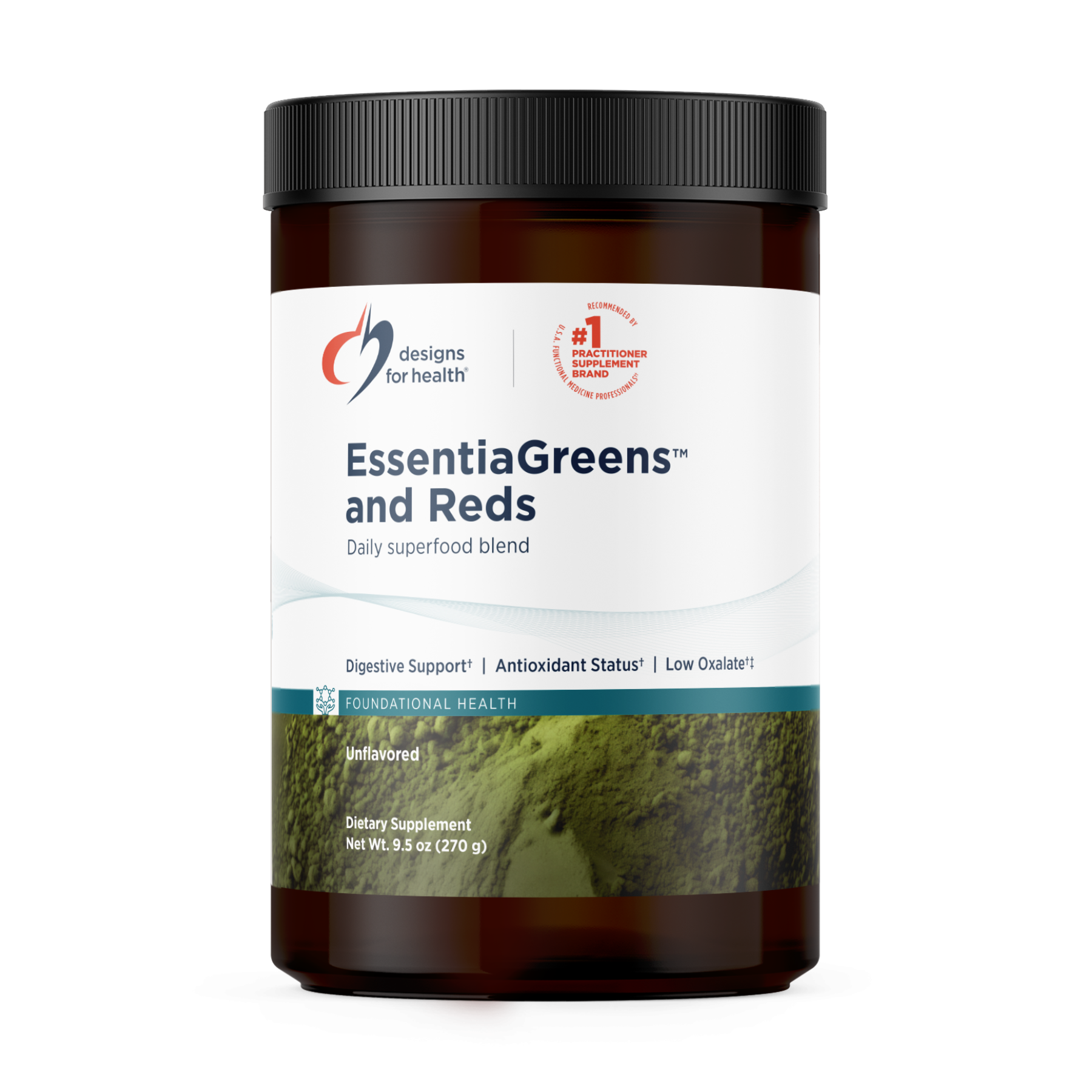 EssentiaGreens and Reds features an oxygen radical absorbance capacity (ORAC) proprietary blend supporting antioxidant status, along with prebiotics to promote digestion.