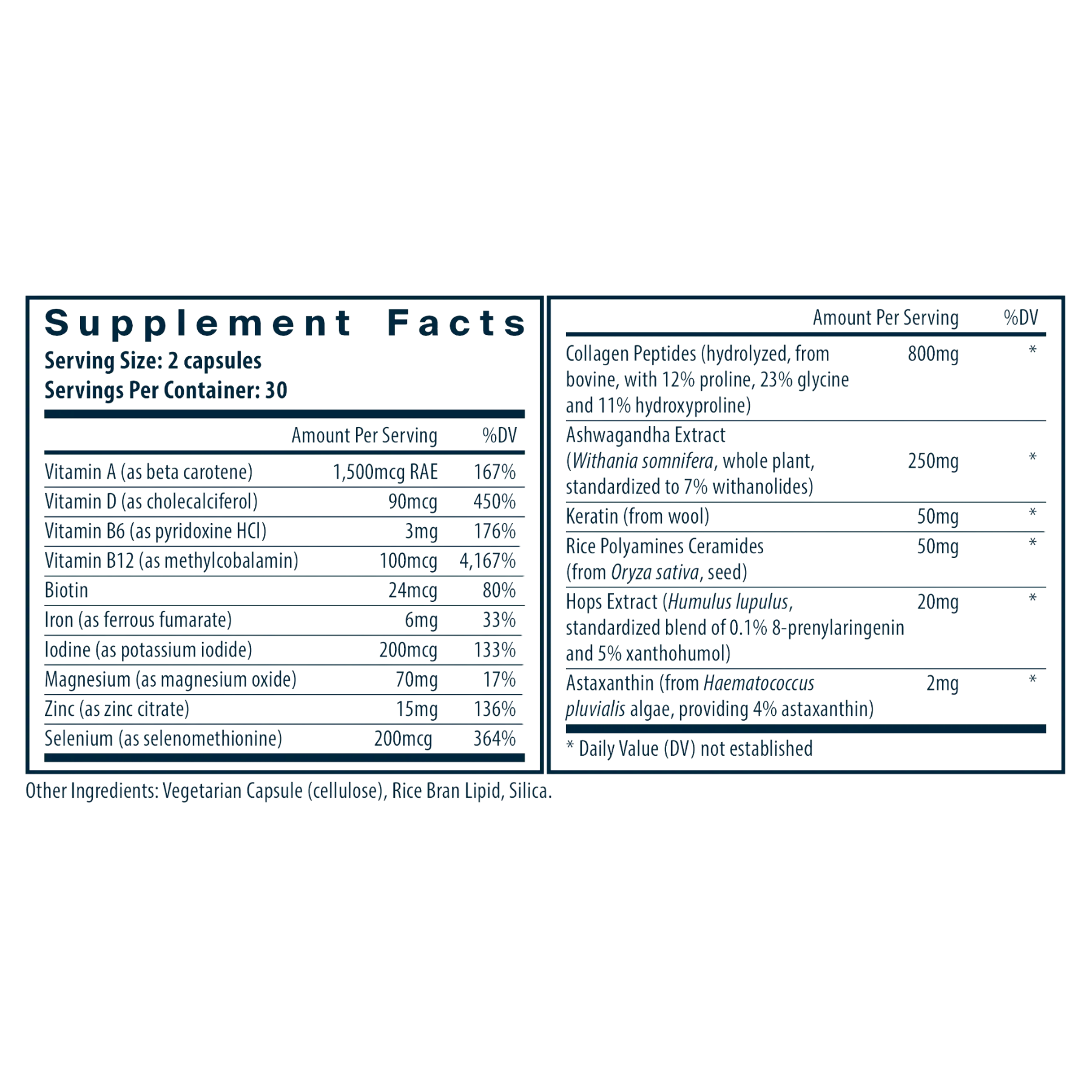 Key ingredients include hops extract for estrogen balance, ashwagandha for stress relief, and collagen hydrolysate for strength. Essential vitamins and minerals like biotin and zinc support optimal scalp health.