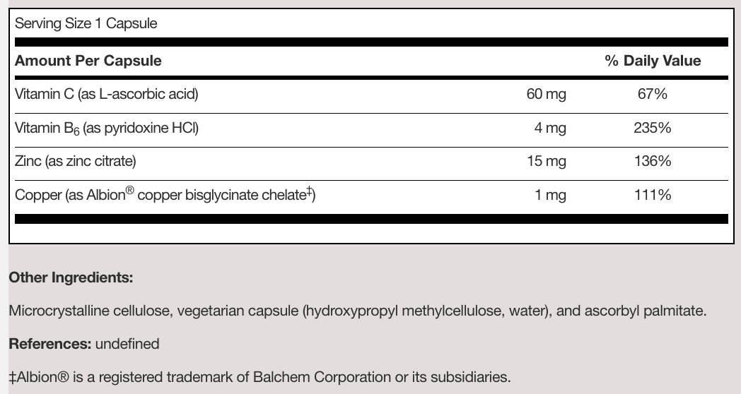 含有鋅、維他命C、維他命B6 和銅的混合物,可最大限度地提高鋅的吸收。 使用這種協同配方有助滋養皮膚健康、免疫功能等。