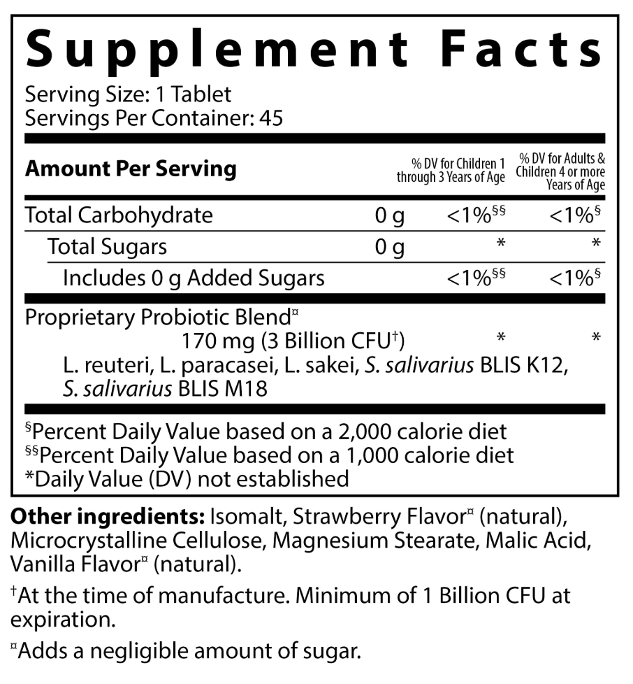 | Proprietary Probiotics Blend: L. reuteri, L. paracasei, L. sakei, S. salivarius BLIS K12, S. salivarius BLIS M18 | 170mg (3 Billion CFU) | * |