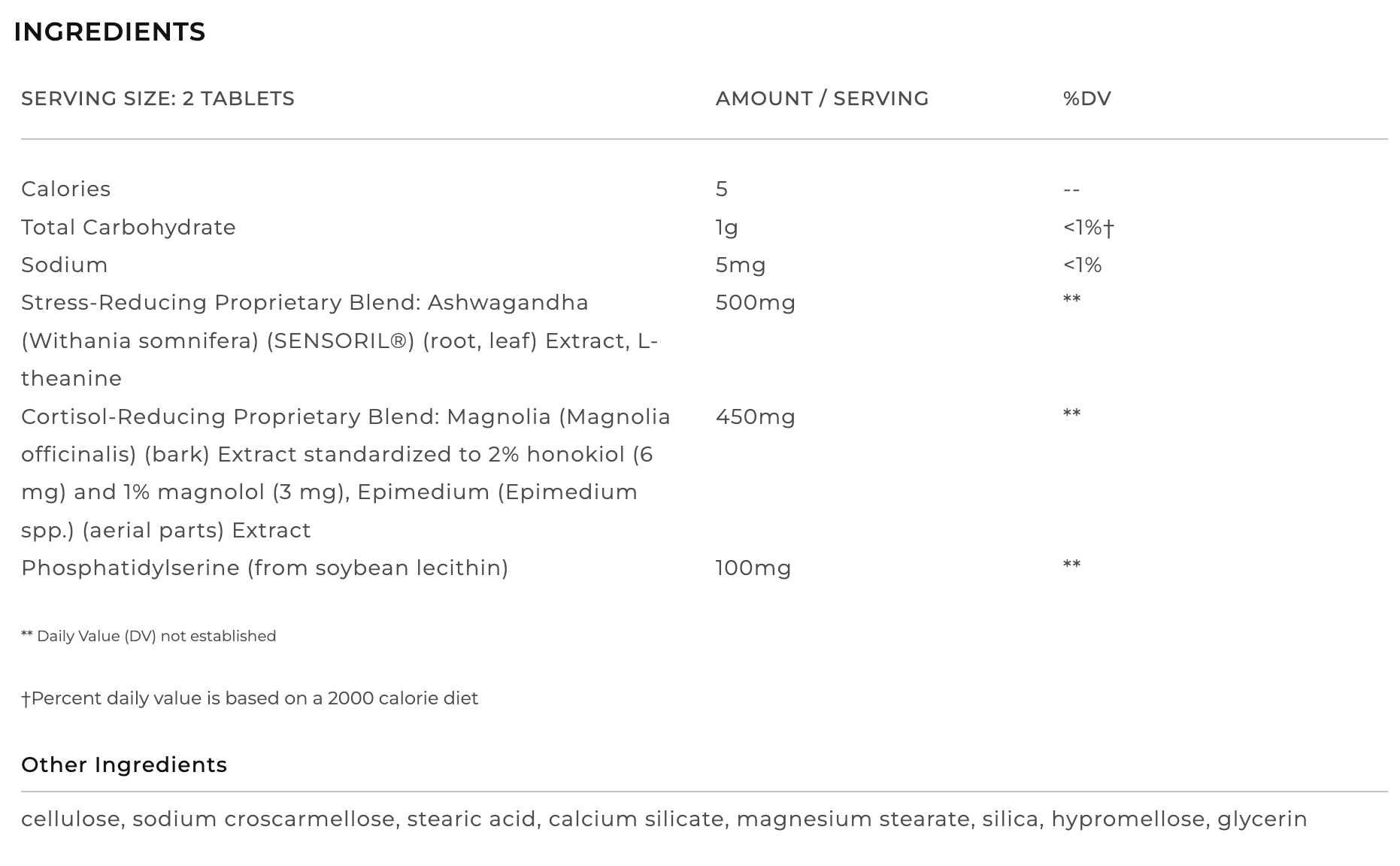 | Stress-Reducing Proprietary Blend: ashwagandha (Withania somnifera) (Sensoril® brand) root and leaf extract, L-theanine (Suntheanine®) |